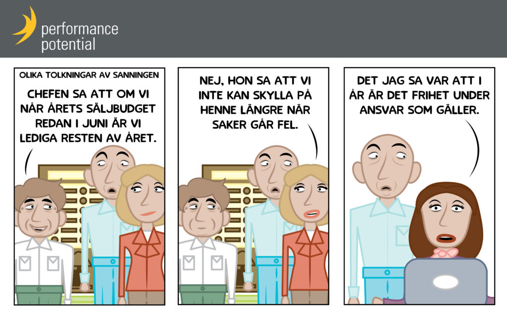 Vi ser och hör utifrån våra erfarenheter och det blir våra tolkningar. Hur vet man att det budskap man som ledare förmedlat verkligen mottas som det är tänkt? En beprövad metod är att be mottagaren att beskriva vad de tycker sig ha hört. Det kan minimera risken att bli feltolkad.